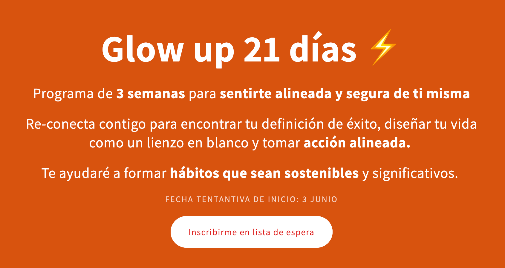 Significa que estás en búsqueda de ser mejor y de seguir crexiendo así que te quiero contar de mi nuevo proyecto, el programa Glow Up 21. Es un reto de 21 días diseñado para ayudarte a diseñar hábitos significativos y mantenerte constante para llevar una vida que se siente alineada a ti y a tu propósito.